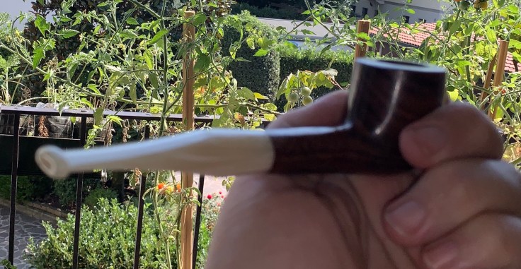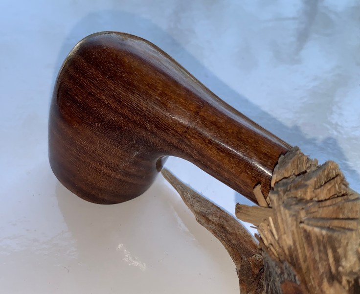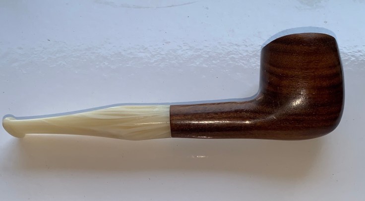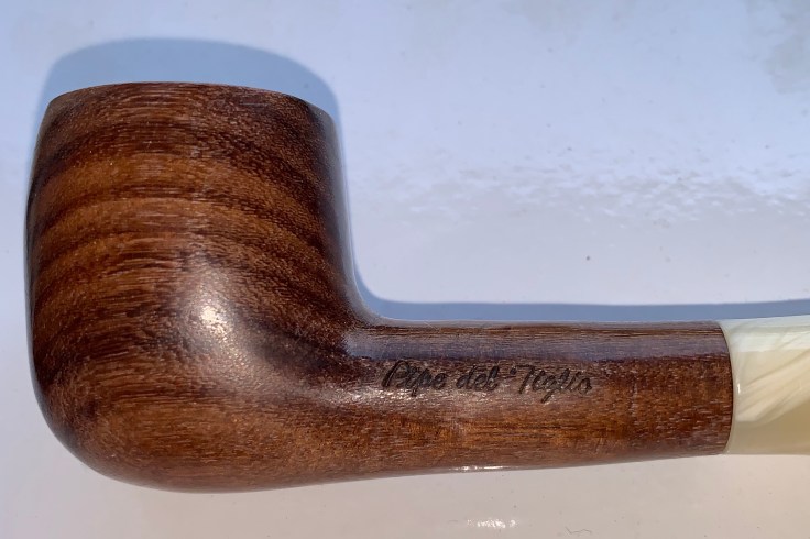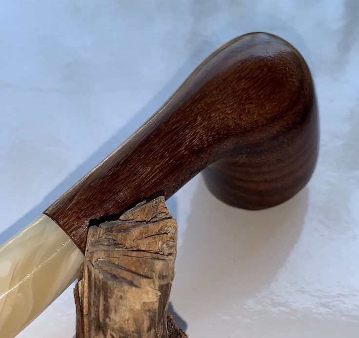 Monta un bocchino pieno color avorio in metacrilato; si tratta di una pipa dalle dimensioni importanti lasciata al naturale e trattata con Danish Oil e cerca di carnauba.