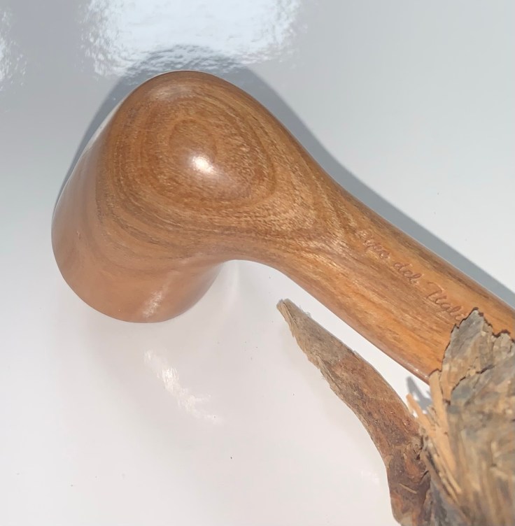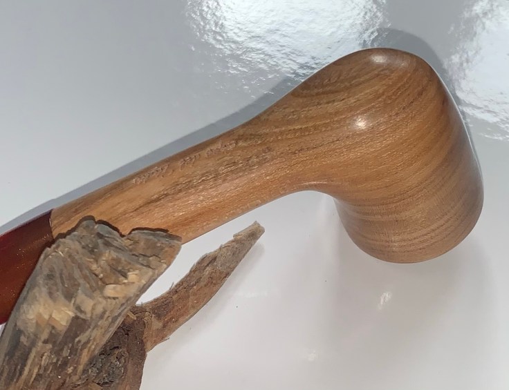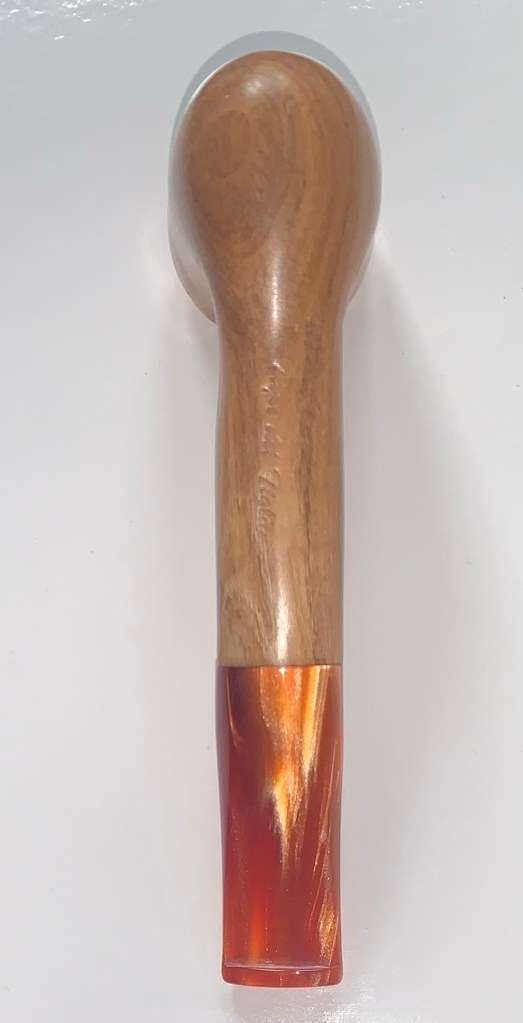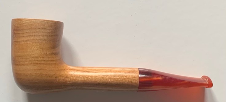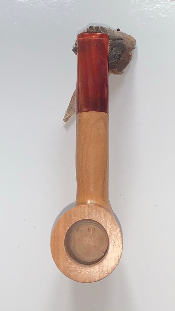 Si è scelto di mantenere la colorazione naturale per lasciare in belle evidenza le venature del ciliegio; è stata trattata con Danish Oil e cera di carnauba e monta un bocchino ovale in metacrilato.