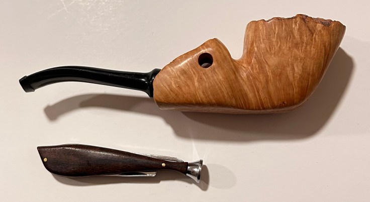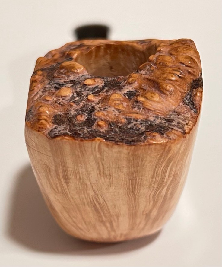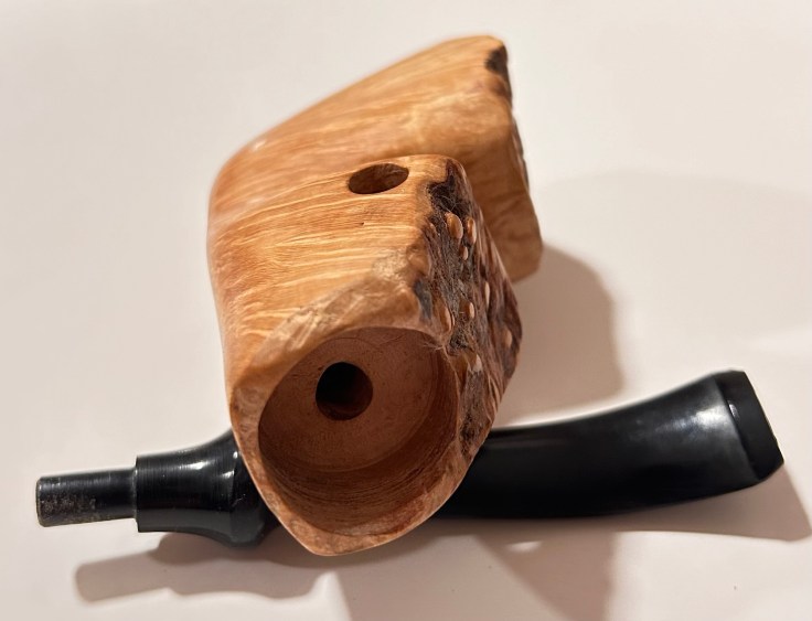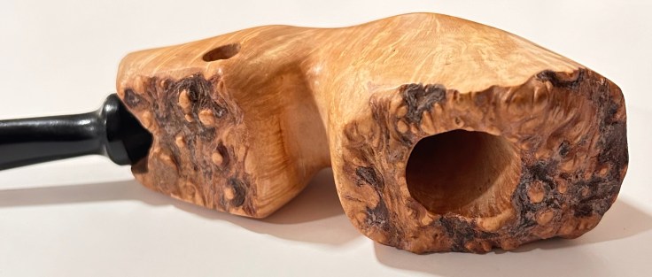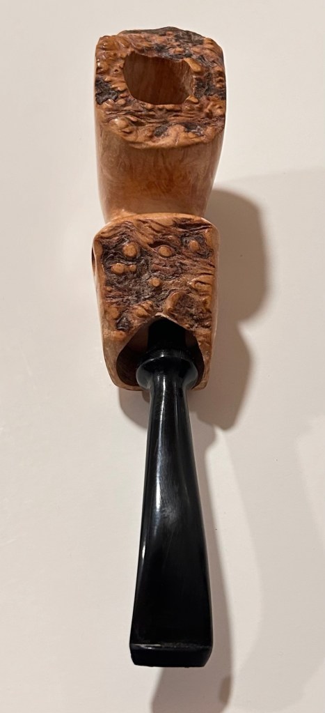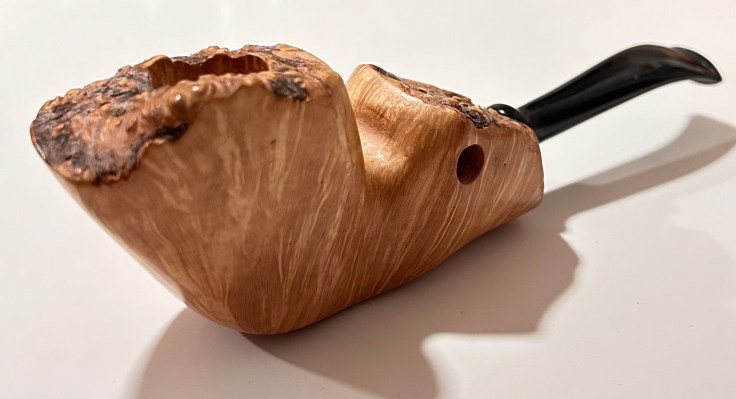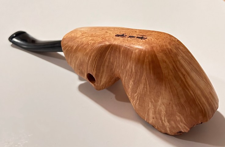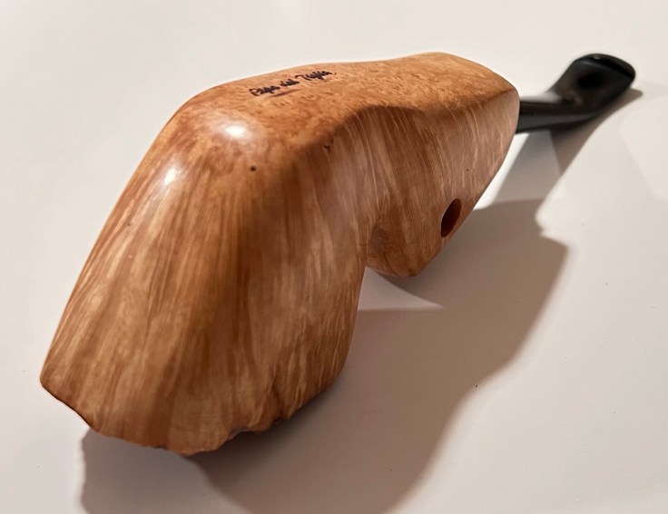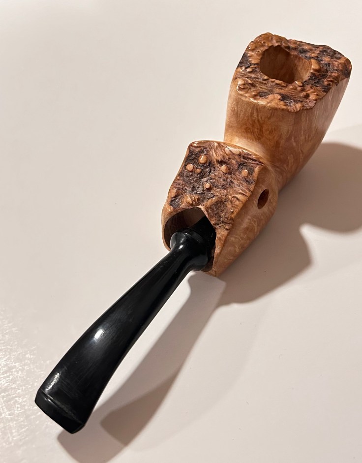 Lo shape è quello di una forma libera; è realizzata con una bella placca in radica fiammata con bocchino semi curvo in ebanite.