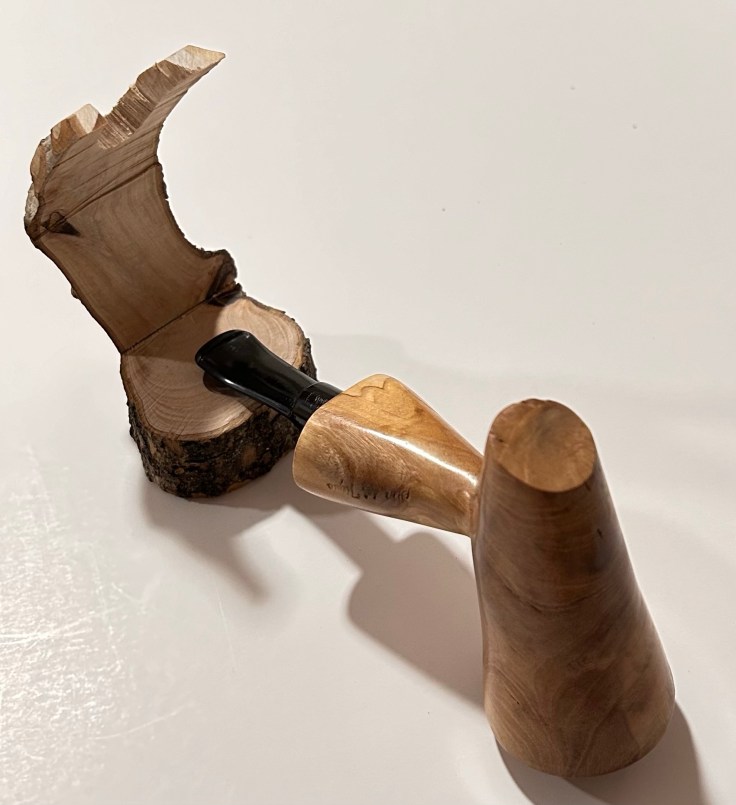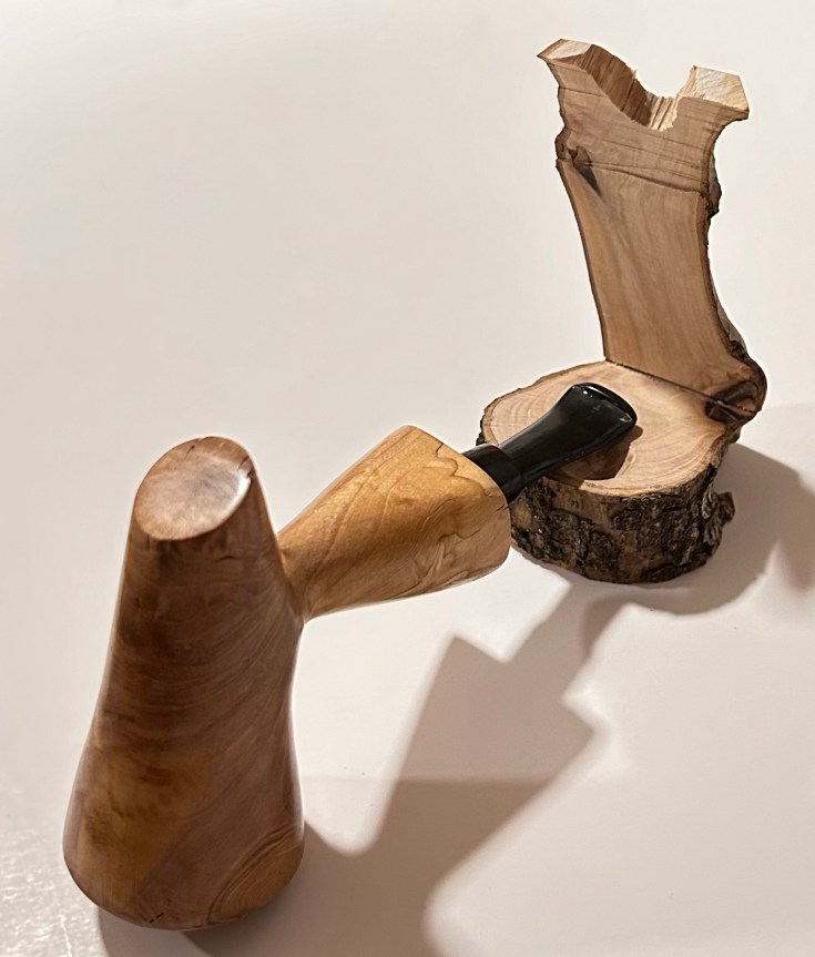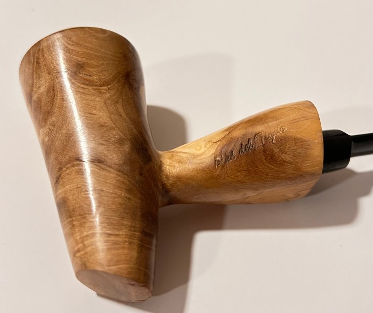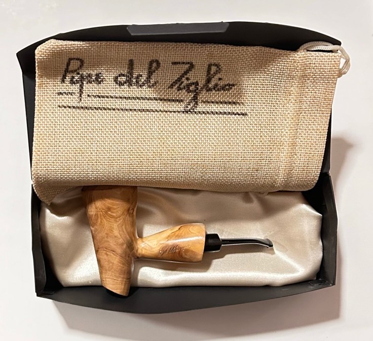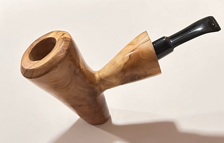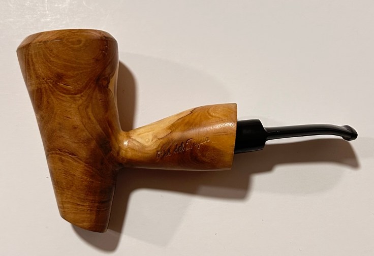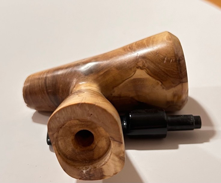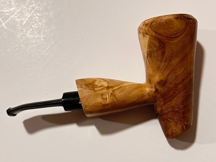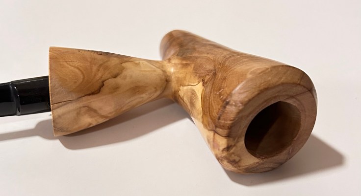 Lo shape è quello di una forma libera; è realizzata con una bella placca di ulivo con bocchino semi curvo in ebanite.