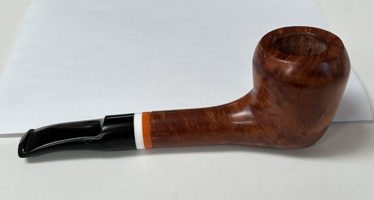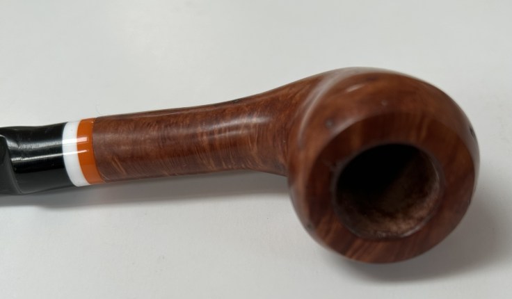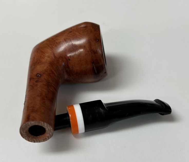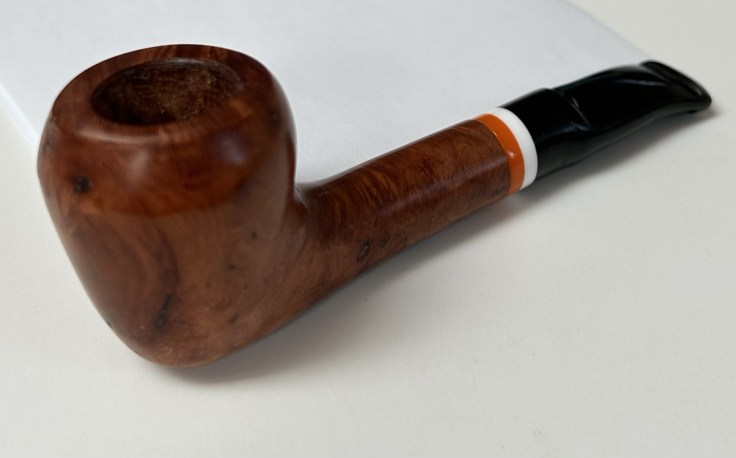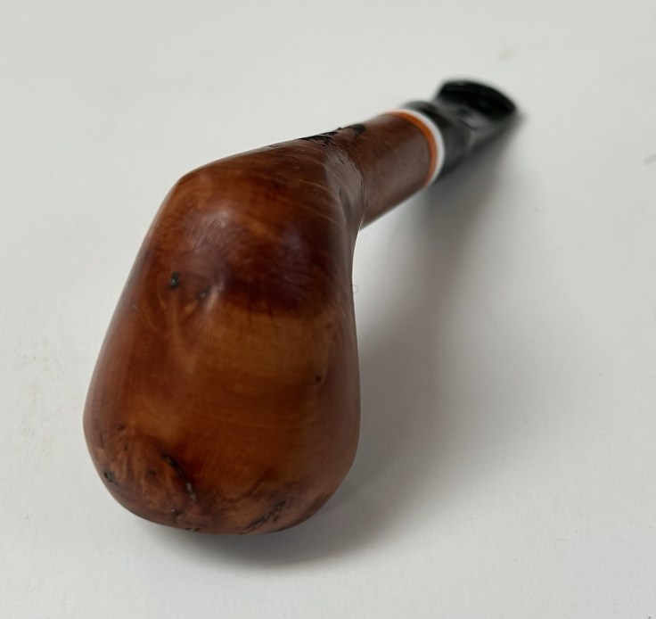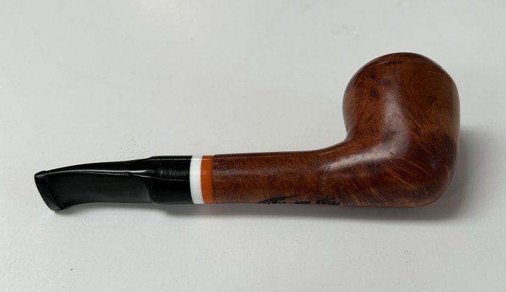 Si tratta di una pipa tascabile lasciata al colore naturale della radica greca, con blocchino in ebanite decorato con due anelli bianco e arancione; il suo peso molto esiguo (28 grammi) la rende estremamente comoda.