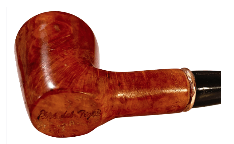 La pipa è nuova, costruita in modo artigianale e curata dal punto di vista estetico; il fornello ha un diametro Interno di 20 mm e una profondità di 41; il diametro esterno è di 39 mm, l’altezza dell’arco di 57 mm e la lunghezza della pipa, 135 mm. Peso: 44 gr.