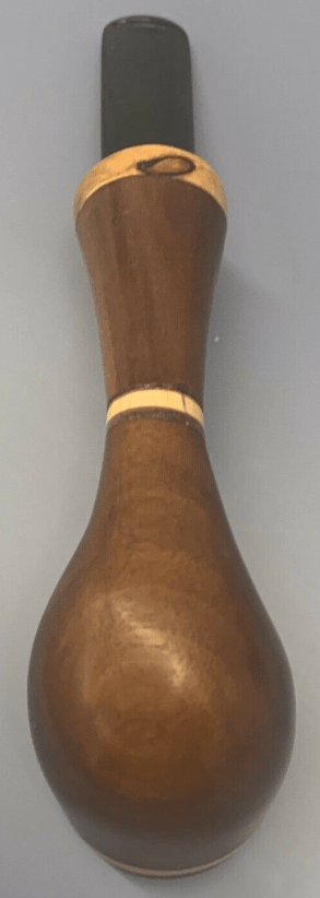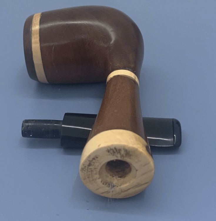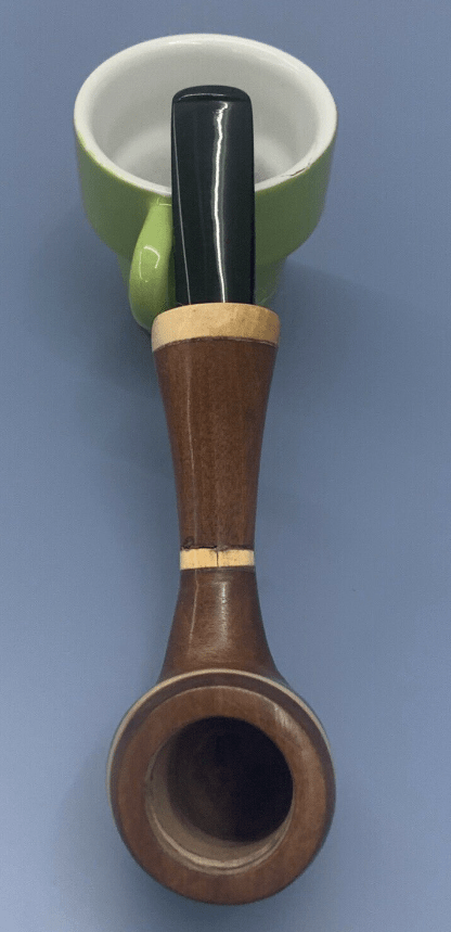 La pipa Elegante è sicuramente molto particolare e assolutamente unica nel suo genere. Si tratta di un mogano lucidato a specchio con cera di carnauba e intarsiato con anelli di frassino. È una pipa bella da vedere e amabile nella fumata. Monta un bocchino in ebanite da 5 cm.